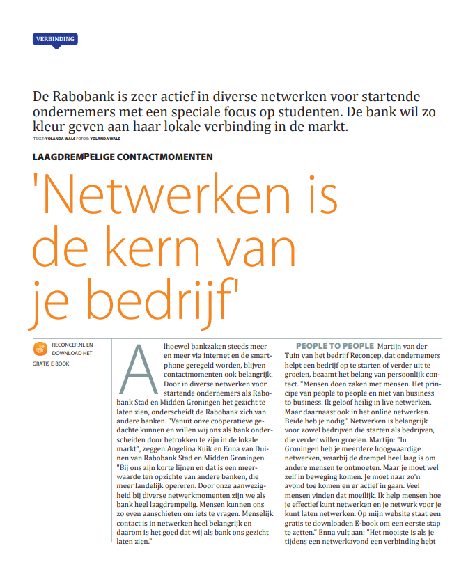Ook tijdens het interview met het Rabobank Magazine ‘Dichterbij’ komen het herkennen van ‘Kansen’ en het organiseren van ‘Acties’ en het belang van Time- Management naar voren😊